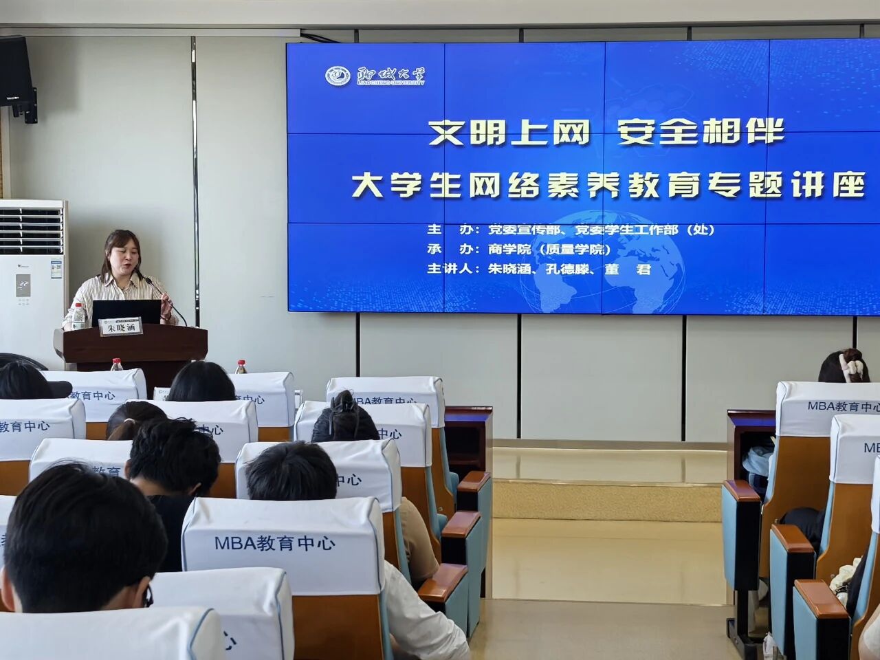 为提升学生网络素养,保护学生网络权益,4月29日,由商学院(质量学院)承办的“文明上网 安全相伴”大学生网络素养教育专题讲座于东校区1#707报告厅举办,学生工作处资助管理中心主任朱晓涵、美术与设计学院团委书记孔德滕、教育科学学院辅导员董君受邀担任主讲人。