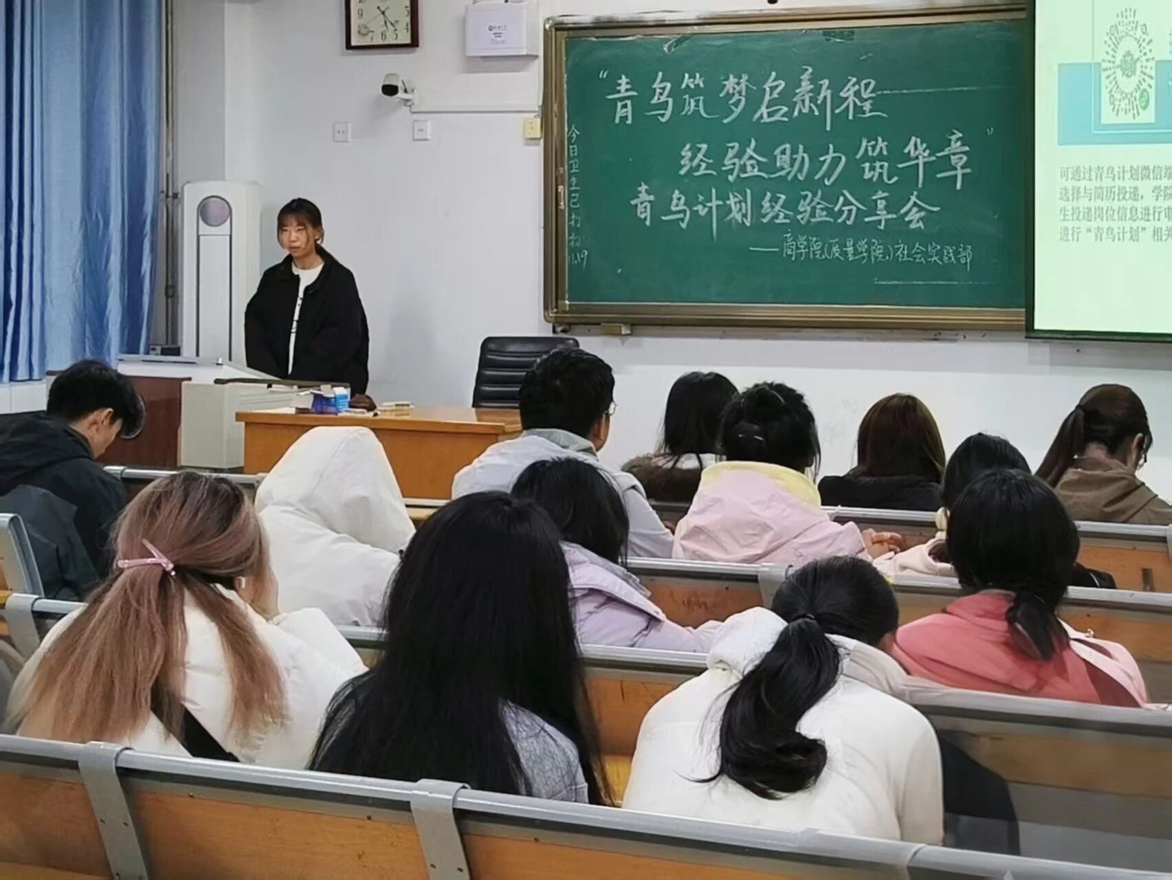为助力学生适配学业与职业发展,11月19日,商学院(质量学院)于1# 305开展“青羽振翅 逐梦新征程”青鸟计划经验分享会,2024级13班王涵、4班翟鹏宇担任主讲人。