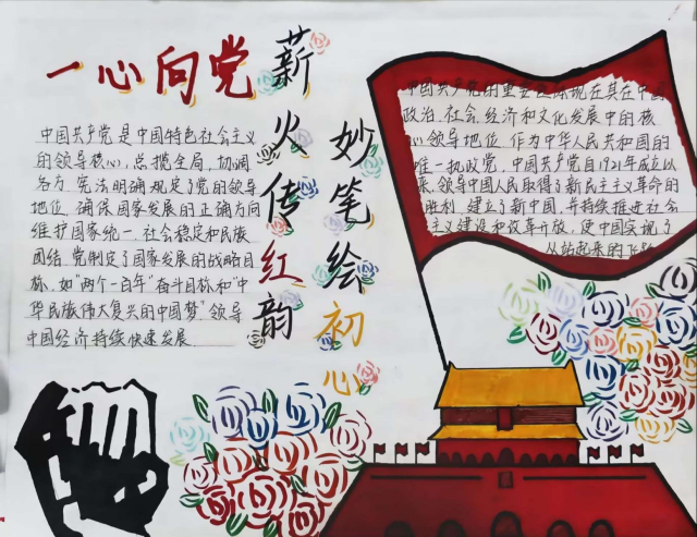 同学们紧扣“富国强国”核心主题,以情怀为笔、感悟为墨,用斑斓色彩勾勒情感温度,从多元视角挥洒创作灵感:手抄报上,天安门檐角高挑着国旗的炽红,商院学子以笔为针,把“富国”初心细细绣进笔墨肌理;画作里,红旗漫卷过建国之初的熹微晨光,也映照着新时代的璀璨星河。笔墨间既承伟人之志,又绘强国盛景,一颗红心照亮奋进征程。这方寸天地间的一抹红,是青春与家国相撞的滚烫回响,更是青年一代捧给时代的赤诚答卷。