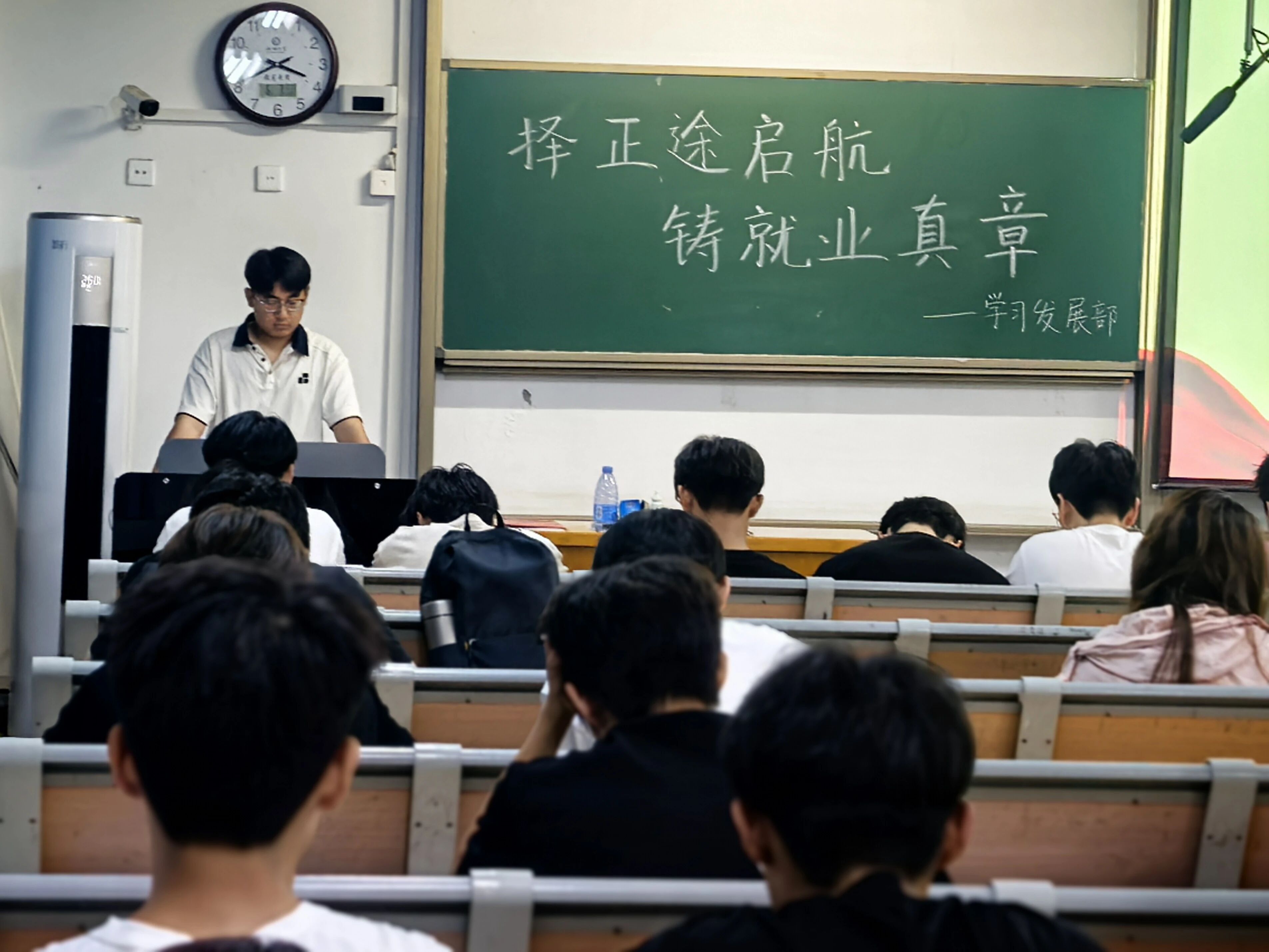 为引导同学们树立正确就业观,将个人理想与国家发展相结合,6月3日, 商学院(质量学院)学生会学习发展部于东校区1#214组织开展“择正途启航铸就业真章”主题团日活动,学院学生会学习发展部干事孔鑫瞳担任主讲人,2022至2024级各班班团参加。
