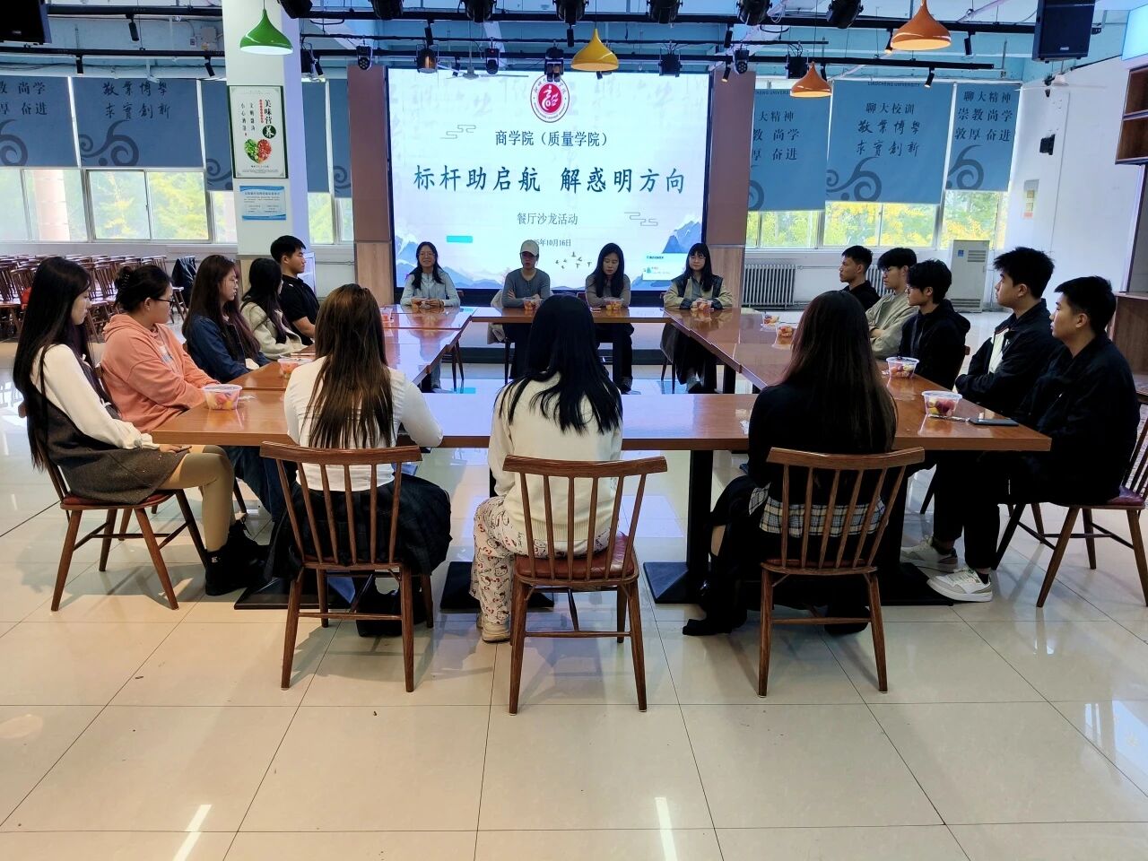 为深入推进学院学风建设,营造积极浓厚的学习氛围,10月16日,商学院(质量学院)于东校区翰苑餐厅二楼举办“标杆助启航 解惑明方向”主题餐厅沙龙活动。2023级6班甄佳慧、2023级11班周于涵受邀分享学习与学科竞赛经验,学院辅导员韩亭亭、刘聪睿及2024级各班学习委员参会。