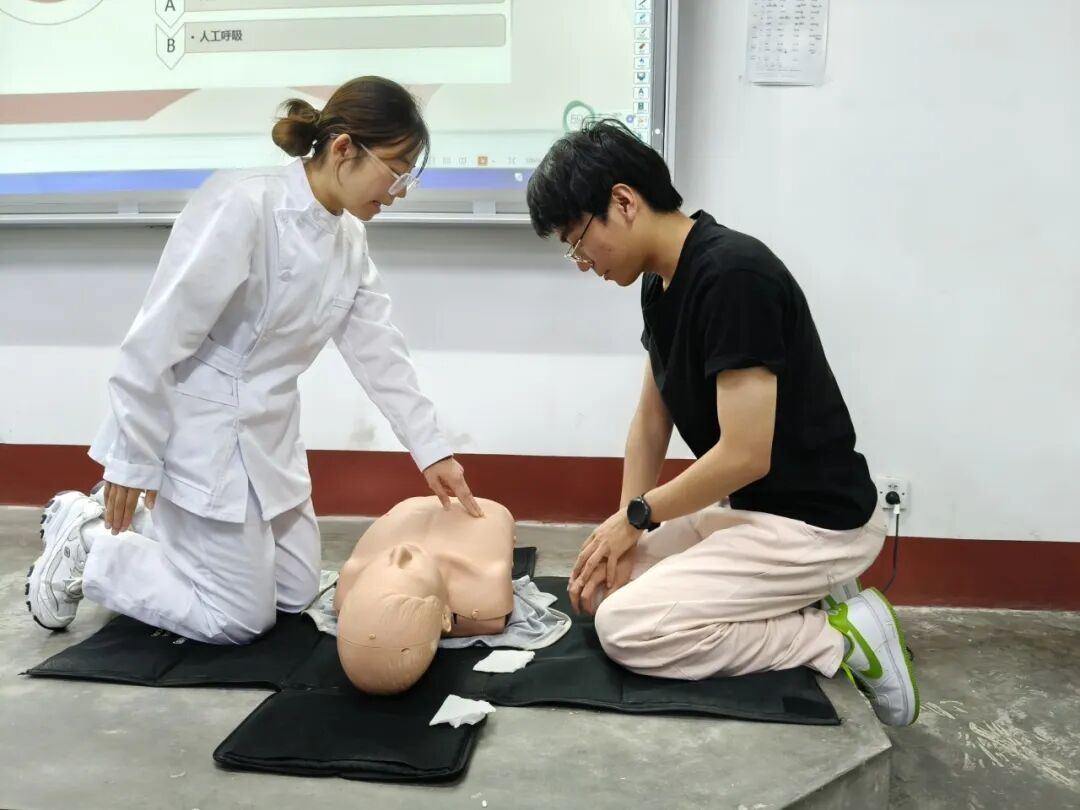 在理论讲解之后,在场学生分组进行心肺复苏和海姆立克急救法的实操训练,“医心向阳”服务队队员积极指导并切实纠正同学们在操作中出现的事务,确保每位学生都能正确掌握操作技巧。