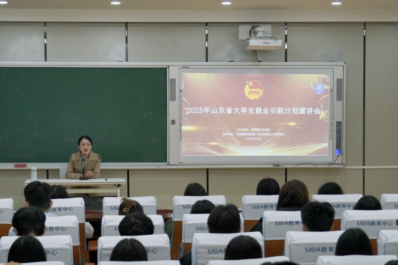 为深化共青团服务青年就业创业行动,服务大学生就业需求,拓宽求职择业渠道,10月16日,我校举办2025年山东省大学生就业引航计划宣讲会,共设置1个主会场和5个分会场。商学院(质量学院)分会场邀请了聊城市财金控股集团有限公司人力资源管理部副经理黄欣开展专场就业指导,通过就业引航、技能辅导和精准帮扶,切实服务学生就业发展需求。