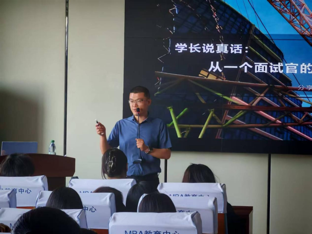 4月28日,为了让更多同学体验到真正的职场氛围,从多角度了解如今市场对人才需求,提高自我素养,精英管理者协会邀请了光明园迪的人资行政总监吕崇,为我院2023级人力资源管理专业学生做了题为《学长说真话:从一个面试官的视角看成长与面试》的精彩讲座。讲座结束后进行了“鲁商杯”聊城大学“职击未来”招聘模拟大赛职场实战赛道院赛选拔。在《学长说真话》的主题报告中,吕崇学长作为我校2015届毕业生,先对母校及老师的辛苦栽培表达了感激之情,然后分享了自身的成长经历。吕崇毕业后的第一份工作是一家乡镇企业的车间工人,他从锂电池配料员的职位做起,慢慢地成长为领导150个人的管理人员,实现了从大学生到职场人的蜕变。