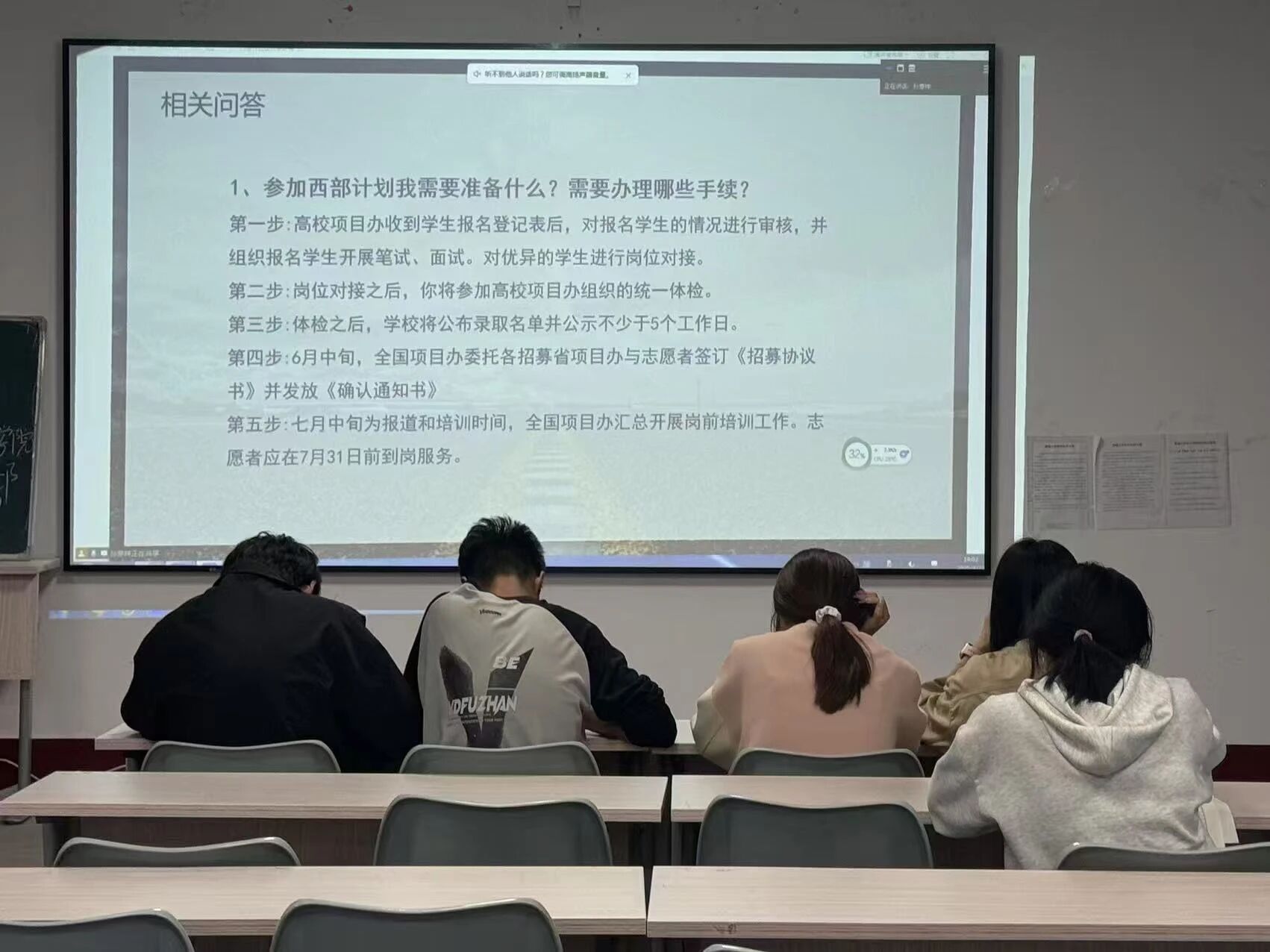 为凝聚青春力量,号召青年学子扎根西部基层奉献青春,4 月 27 日,商学院(质量学院)以线上形式在 1#201 教室举办西部计划专题宣讲会,志愿服务部孙意祥、杨淑鸣担任主讲人,以丰富的讲解内容与多元的展示形式,为同学们徐徐展开西部发展的崭新画卷。