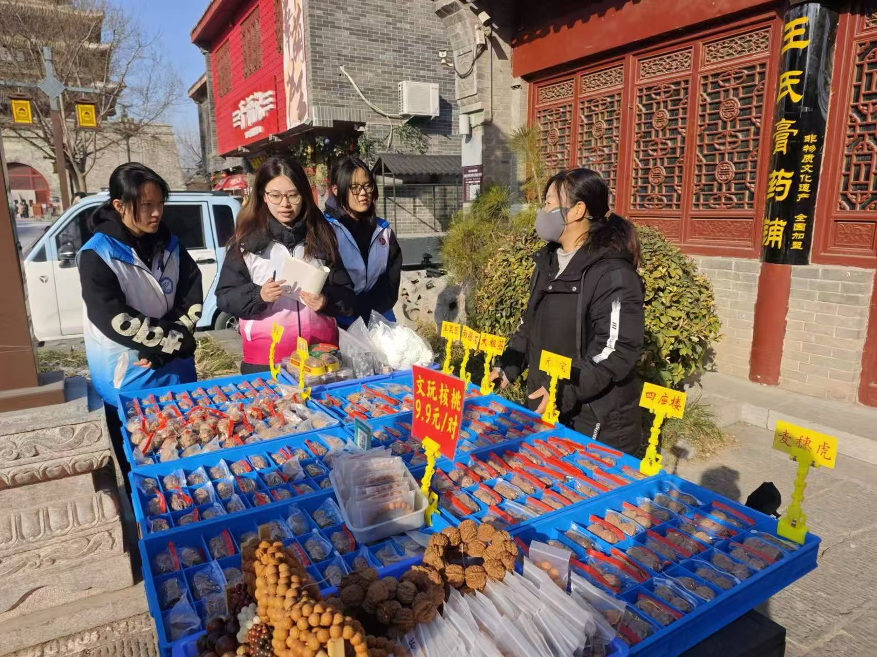 活动以国家级重点文物保护单位光岳楼为核心,实践队员有序参观,实地观察其榫卯结构、彩绘纹饰与建筑形制,在讲解与史料对照中梳理其从明代军事要隘到文化地标的历史演变,感受古代工匠技艺与智慧。通过沿古楼广场街巷走访多家老字号,记录东昌府熏鸡、手工粗布、木版年画等传统手艺传承现状,实践队员积极观察艺人将现代审美融入传统工艺的实践路径,并与原住民、经营者深入交流,收集街巷由来、民俗习俗、古城变迁等民间记忆,了解“拆旧补旧、修旧如旧”的保护理念,直观感受聊城在守护古城风貌、活化传承传统文化方面的努力与成效