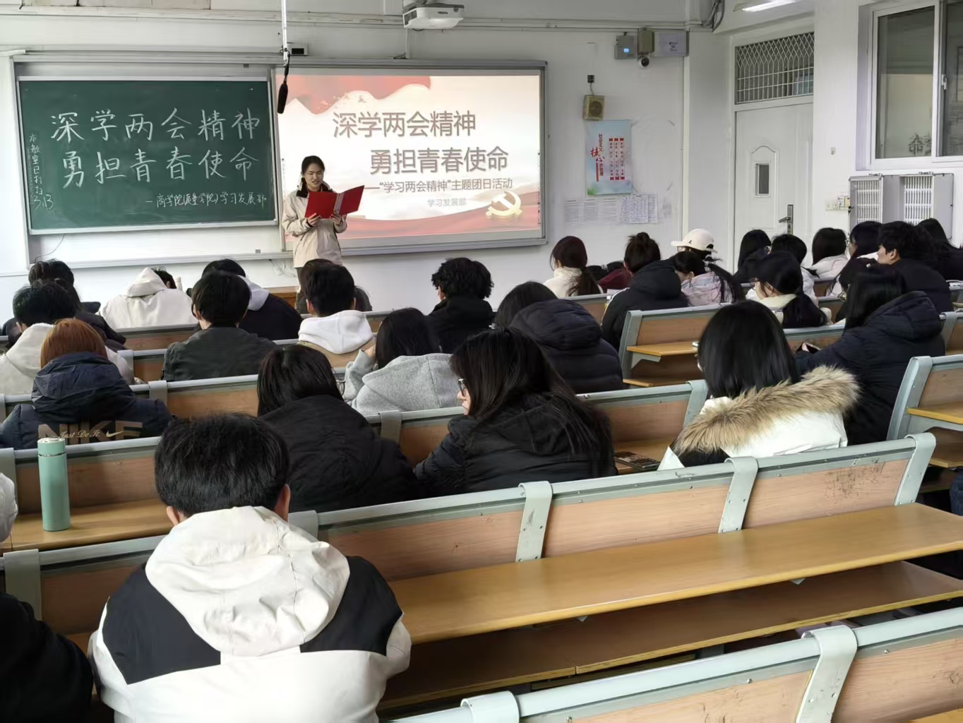 为引导广大团员深刻领会2026年全国两会精神,将个人理想融入国家发展大局,3月15日,商学院(质量学院)于209室开展“深学两会精神,勇担青春使命”主题团日活动,学习发展部崔梦娅担任主讲人,2023级、2024级、2025级班团参会。